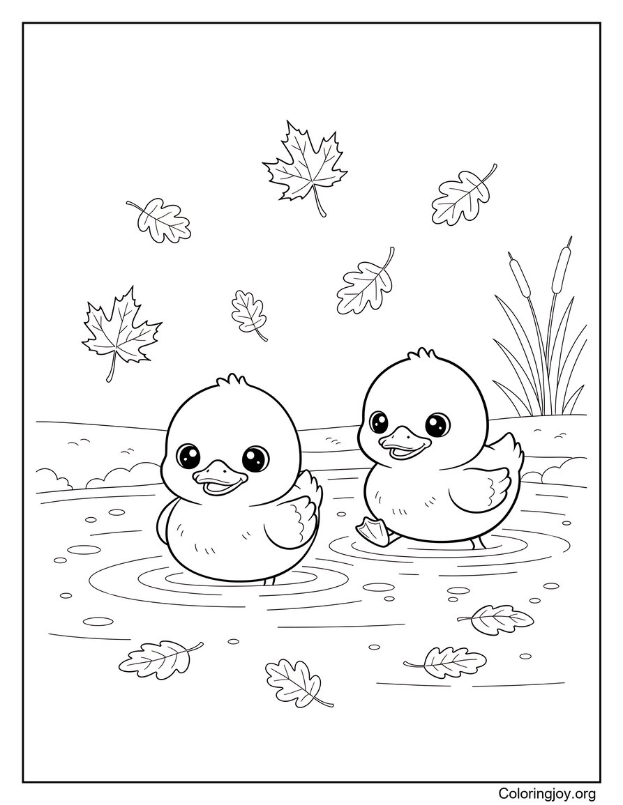 This Autumn Leaves And Ducklings coloring page is available as a JPG file (54 KB) and a high-quality PDF version (329 KB). Download and print it for free, or explore more Duck And Duckling coloring pages in the same category.