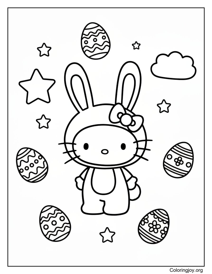 This Bunny Costume Wave coloring page is available as a JPG file (56 KB) and a high-quality PDF version (308 KB). Download and print it for free, or explore more Hello Kitty Easter coloring pages in the same category.
