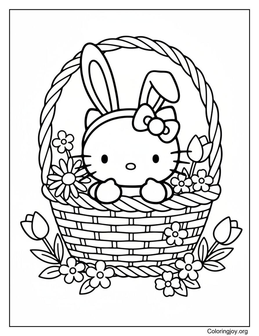 This Bunny Ears Flower Basket coloring page is available as a JPG file (79 KB) and a high-quality PDF version (391 KB). Download and print it for free, or explore more Hello Kitty Easter coloring pages in the same category.