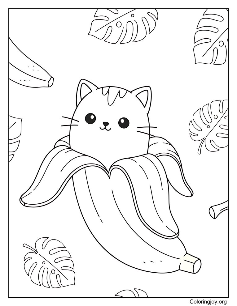 This Cute Banana Cat coloring page is available as a JPG file (48 KB) and a high-quality PDF version (348 KB). Download and print it for free, or explore more Banana coloring pages in the same category.