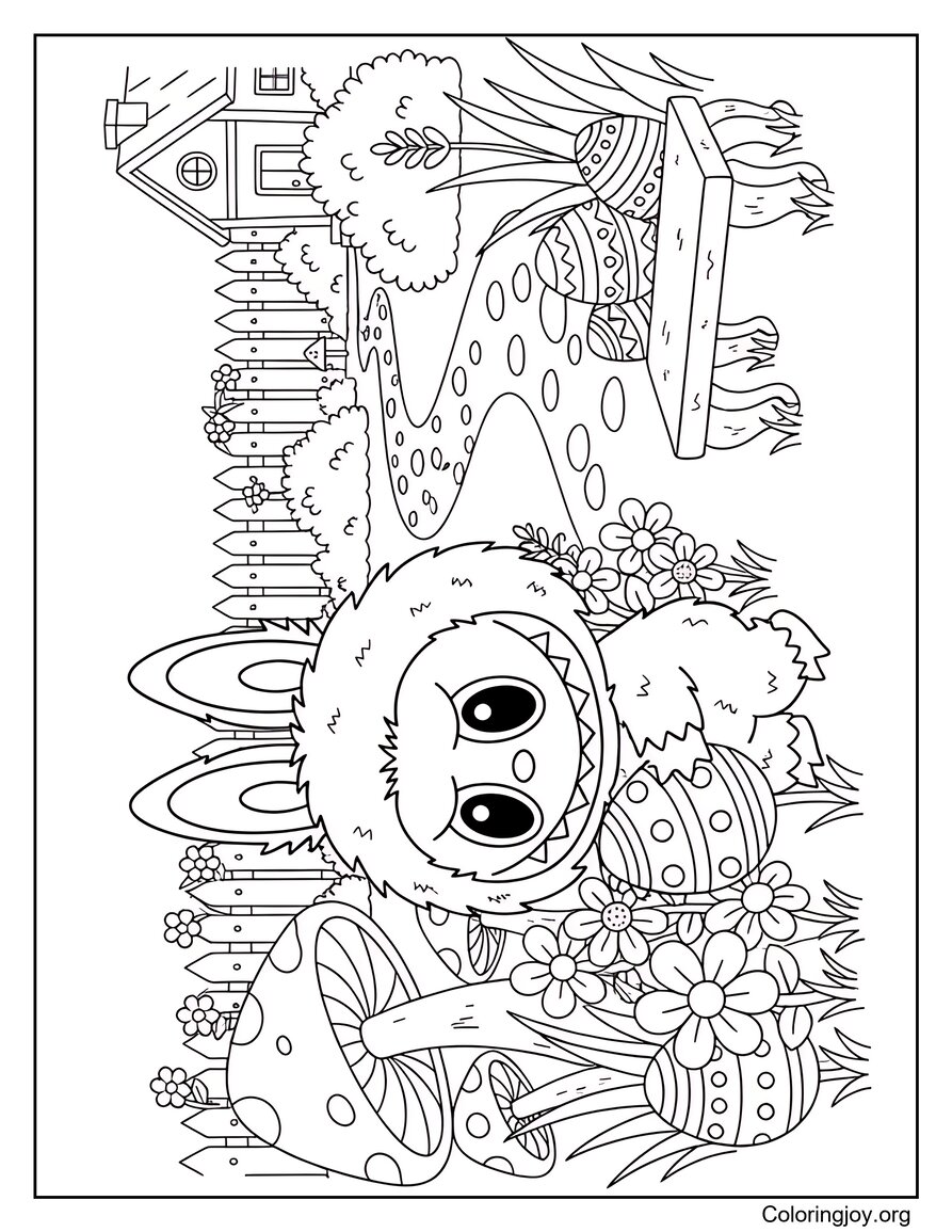 This Cute Labubu Hiding Easter Eggs coloring page is available as a JPG file (131 KB) and a high-quality PDF version (616 KB). Download and print it for free, or explore more Labubu Easter coloring pages in the same category.