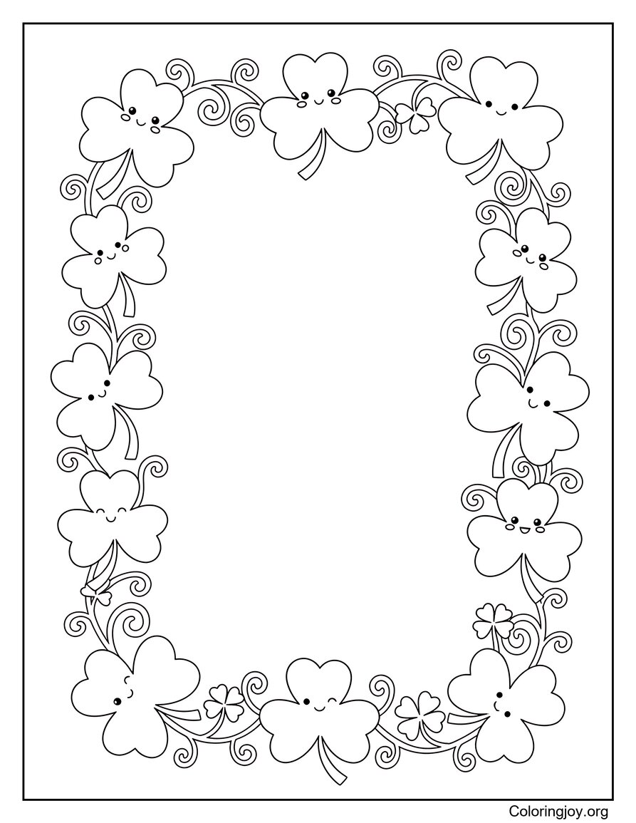 Smiling shamrocks and gentle vines create a border that feels joyful to color.