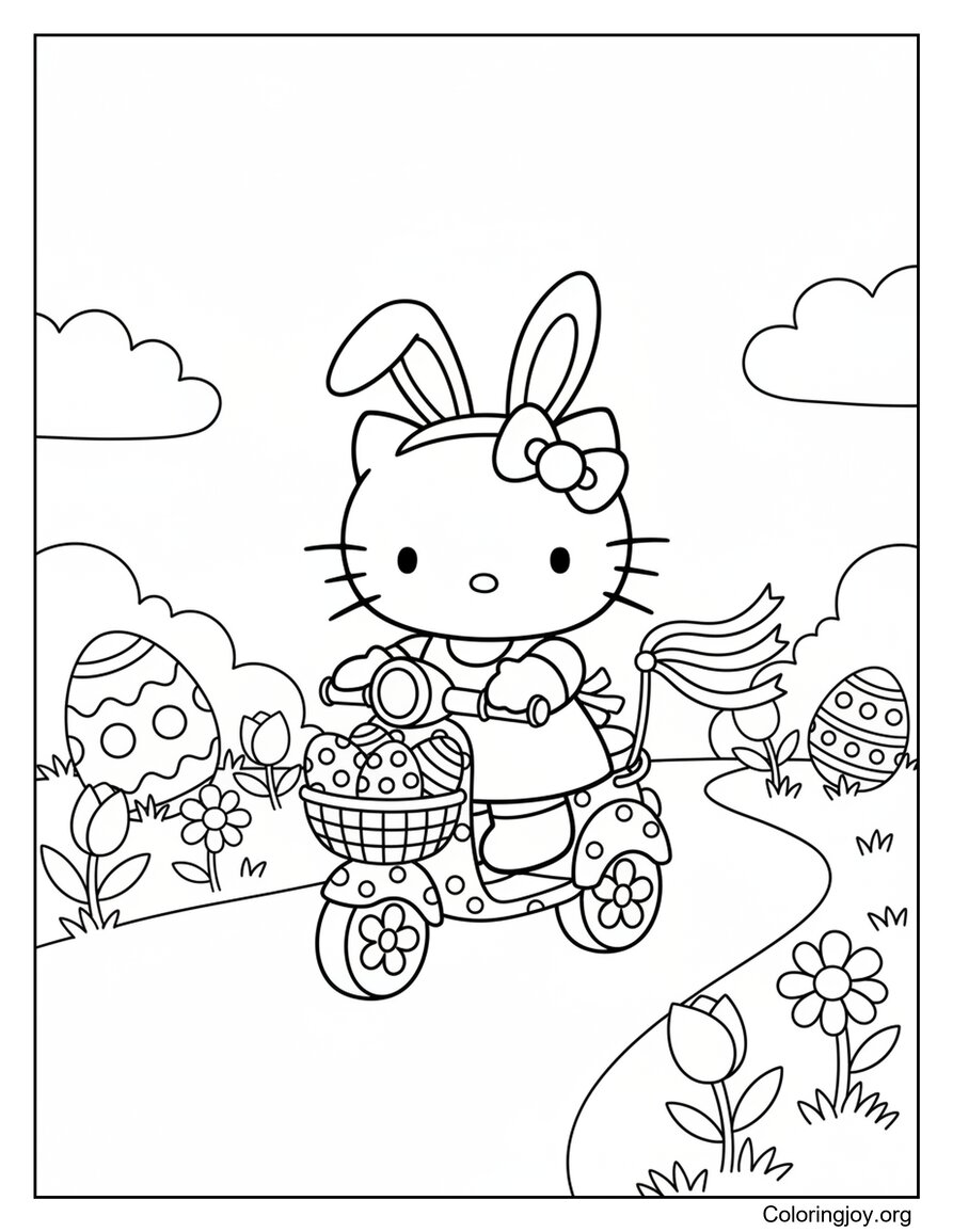 This Easter Scooter Ride coloring page is available as a JPG file (71 KB) and a high-quality PDF version (350 KB). Download and print it for free, or explore more Hello Kitty Easter coloring pages in the same category.