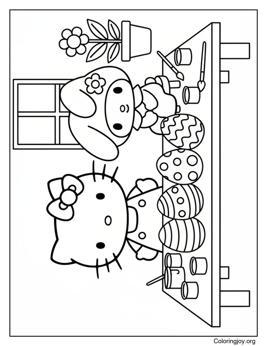 This Egg Pattern Painting Fun coloring page is available as a JPG file (55 KB) and a high-quality PDF version (343 KB). Download and print it for free, or explore more Hello Kitty Easter coloring pages in the same category.