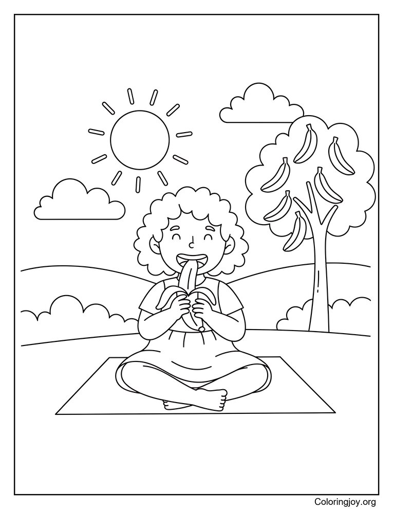 This Girl Eating A Banana coloring page is available as a JPG file (41 KB) and a high-quality PDF version (322 KB). Download and print it for free, or explore more Banana coloring pages in the same category.