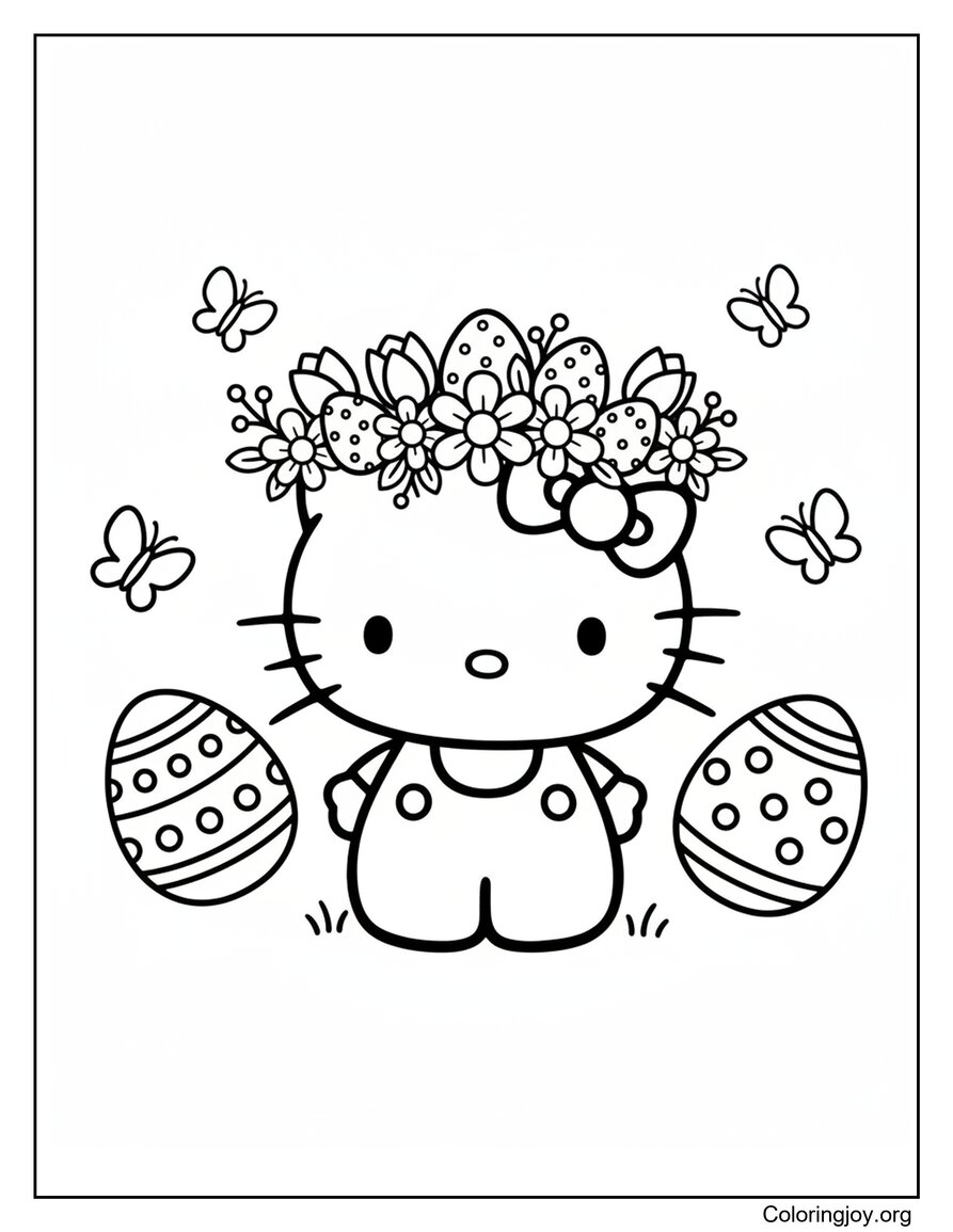 This Hello Kitty Floral Easter Crown coloring page is available as a JPG file (54 KB) and a high-quality PDF version (298 KB). Download and print it for free, or explore more Hello Kitty Easter coloring pages in the same category.