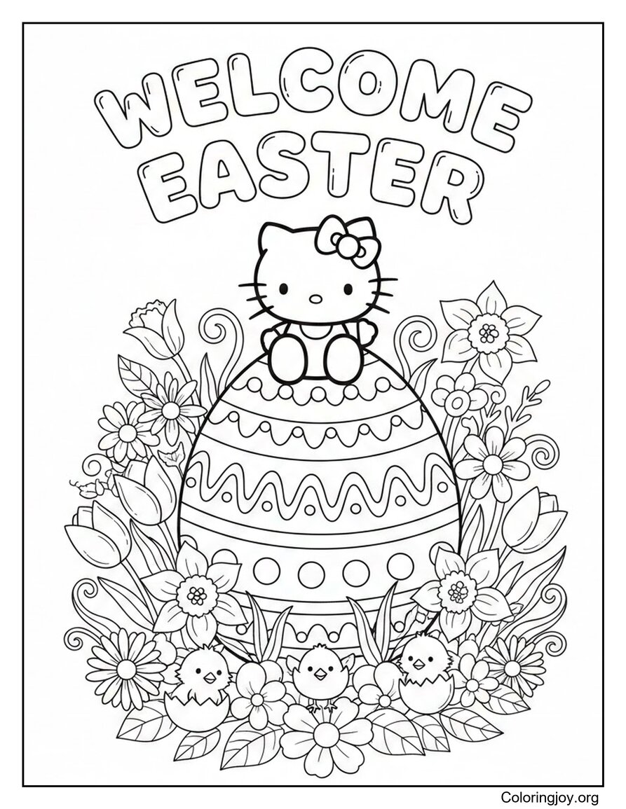 This Hello Kitty Giant Egg Welcome Easter coloring page is available as a JPG file (127 KB) and a high-quality PDF version (524 KB). Download and print it for free, or explore more Hello Kitty Easter coloring pages in the same category.