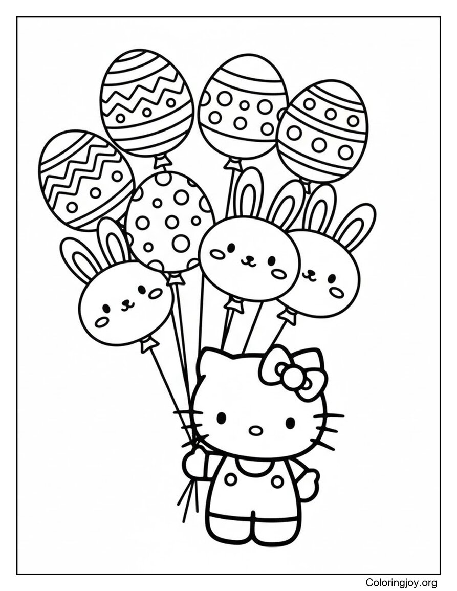 This Hello Kitty Holds Easter Themed Balloons coloring page is available as a JPG file (66 KB) and a high-quality PDF version (353 KB). Download and print it for free, or explore more Hello Kitty Easter coloring pages in the same category.