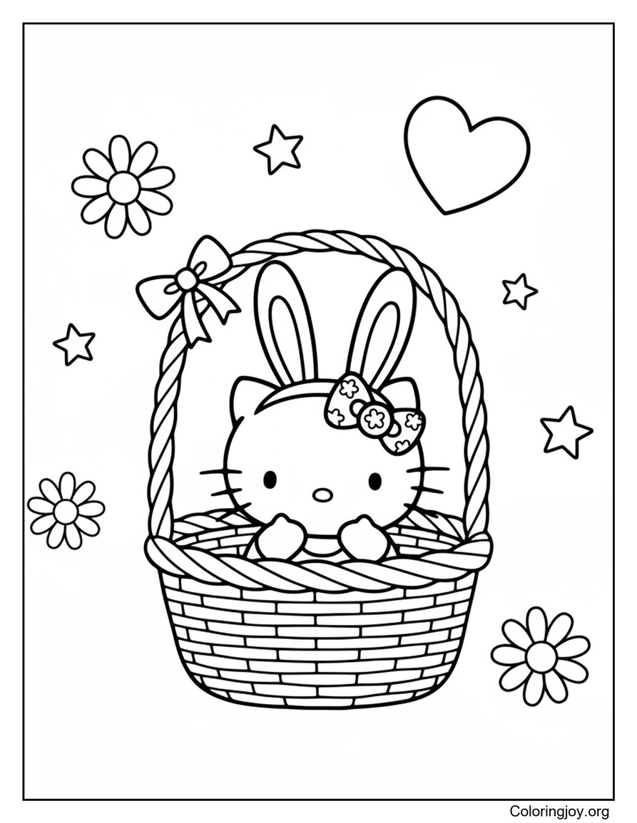 This Hello Kitty Bunny Basket coloring page is available as a JPG file (65 KB) and a high-quality PDF version (339 KB). Download and print it for free, or explore more Hello Kitty Easter coloring pages in the same category.