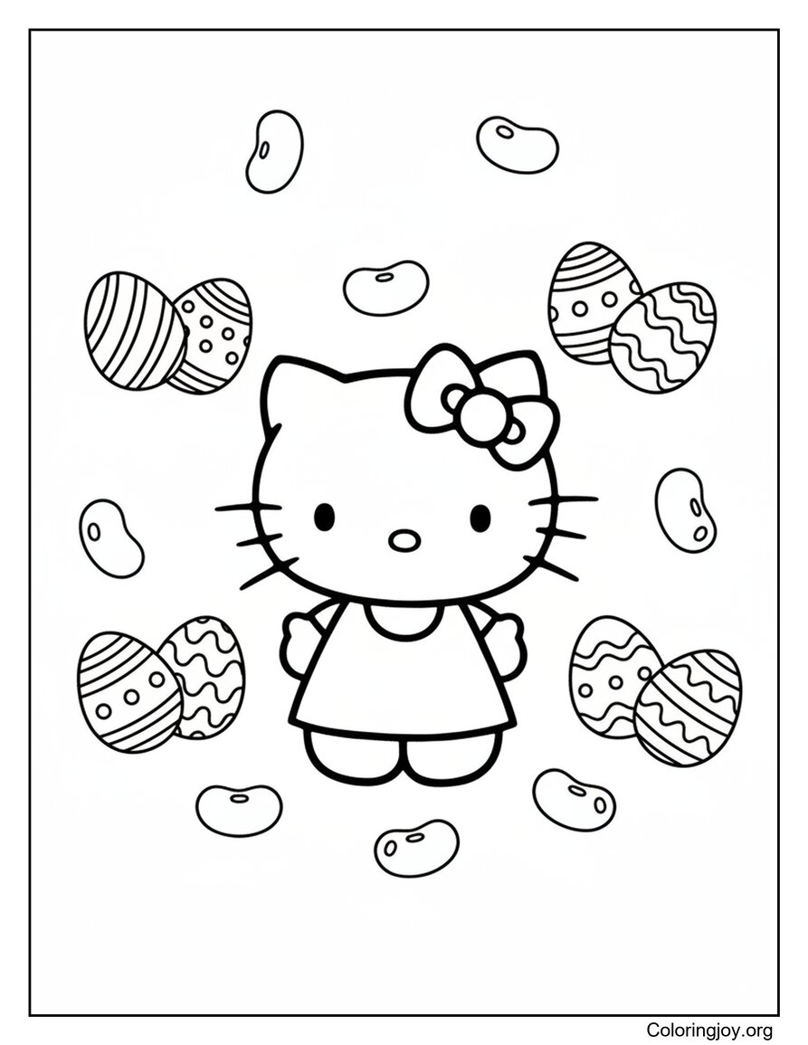 This Hello Kitty With Jelly Beans coloring page is available as a JPG file (48 KB) and a high-quality PDF version (286 KB). Download and print it for free, or explore more Hello Kitty Easter coloring pages in the same category.