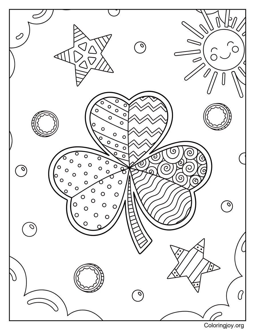 A cheerful four-leaf clover sits among big simple stars, perfect for young artists to enjoy.
