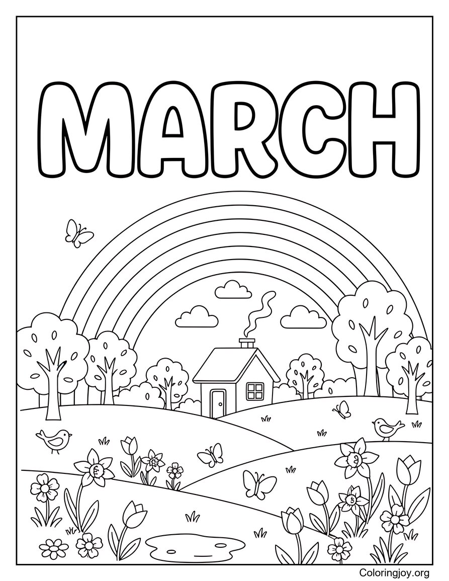 This March Rainbow After A Gentle Spring Rain coloring page is available as a JPG file (98 KB) and a high-quality PDF version (491 KB). Download and print it for free, or explore more March 2026 coloring pages in the same category.