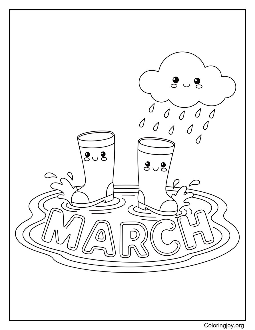 That rainy spring scene captures splashing boots, smiling sunshine, and puddle ripples spelling MARCH.