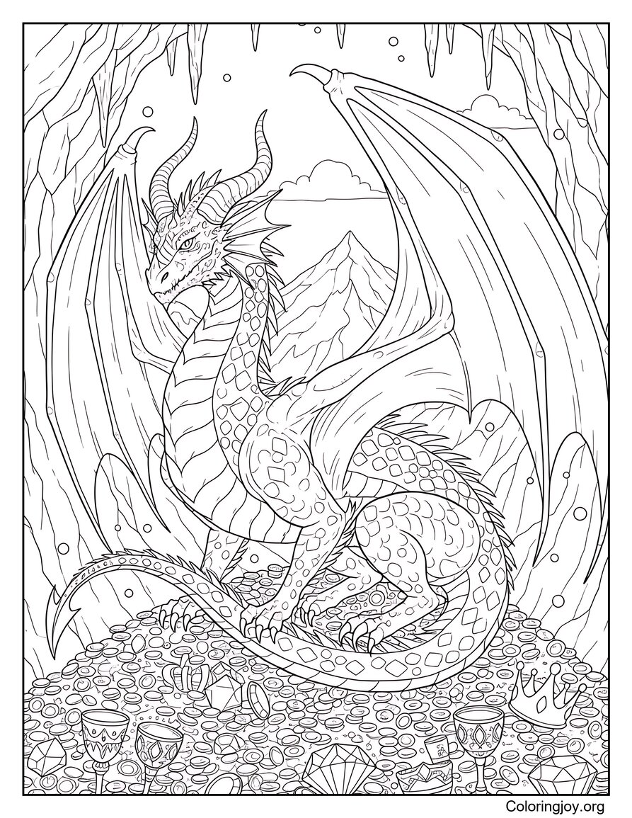 This Realistic coloring page of dragon protects treasure deep inside a mountain cave. R