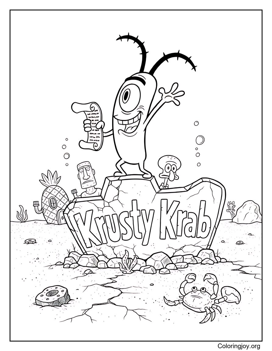 This Sheldon J Plankton On Top Krusty Krab coloring page is available as a JPG file (93 KB) and a high-quality PDF version (464 KB). Download and print it for free, or explore more Spongebob coloring pages in the same category.