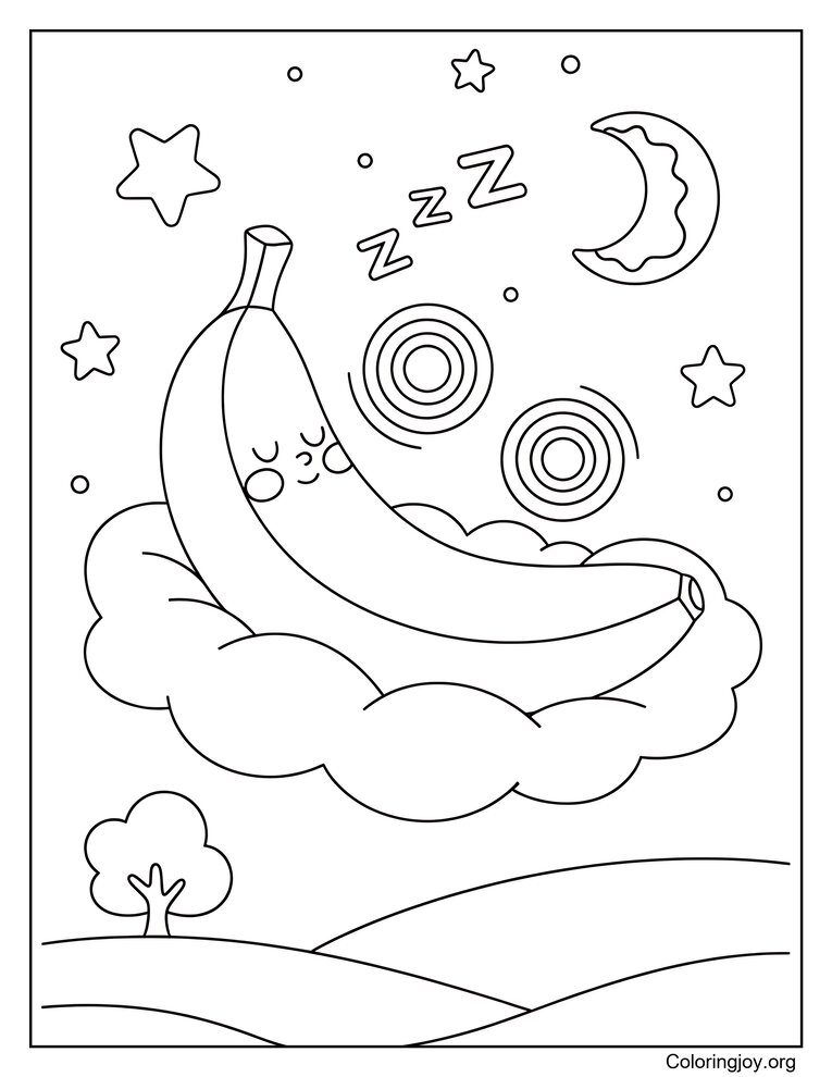 This Sleeping Banana coloring page is available as a JPG file (39 KB) and a high-quality PDF version (310 KB). Download and print it for free, or explore more Banana coloring pages in the same category.