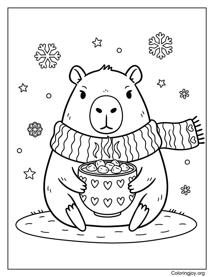 Warm winter feelings glow as a capybara in a scarf holds hot chocolate with a peaceful smile.