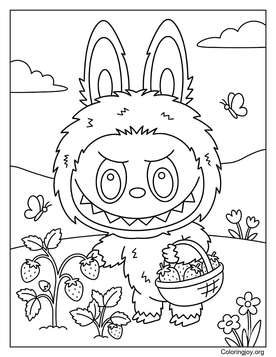 This Labubu Picking Strawberries coloring page is available as a JPG file (87 KB) and a high-quality PDF version (492 KB). Download and print it for free, or explore more Labubu Spring coloring pages in the same category.