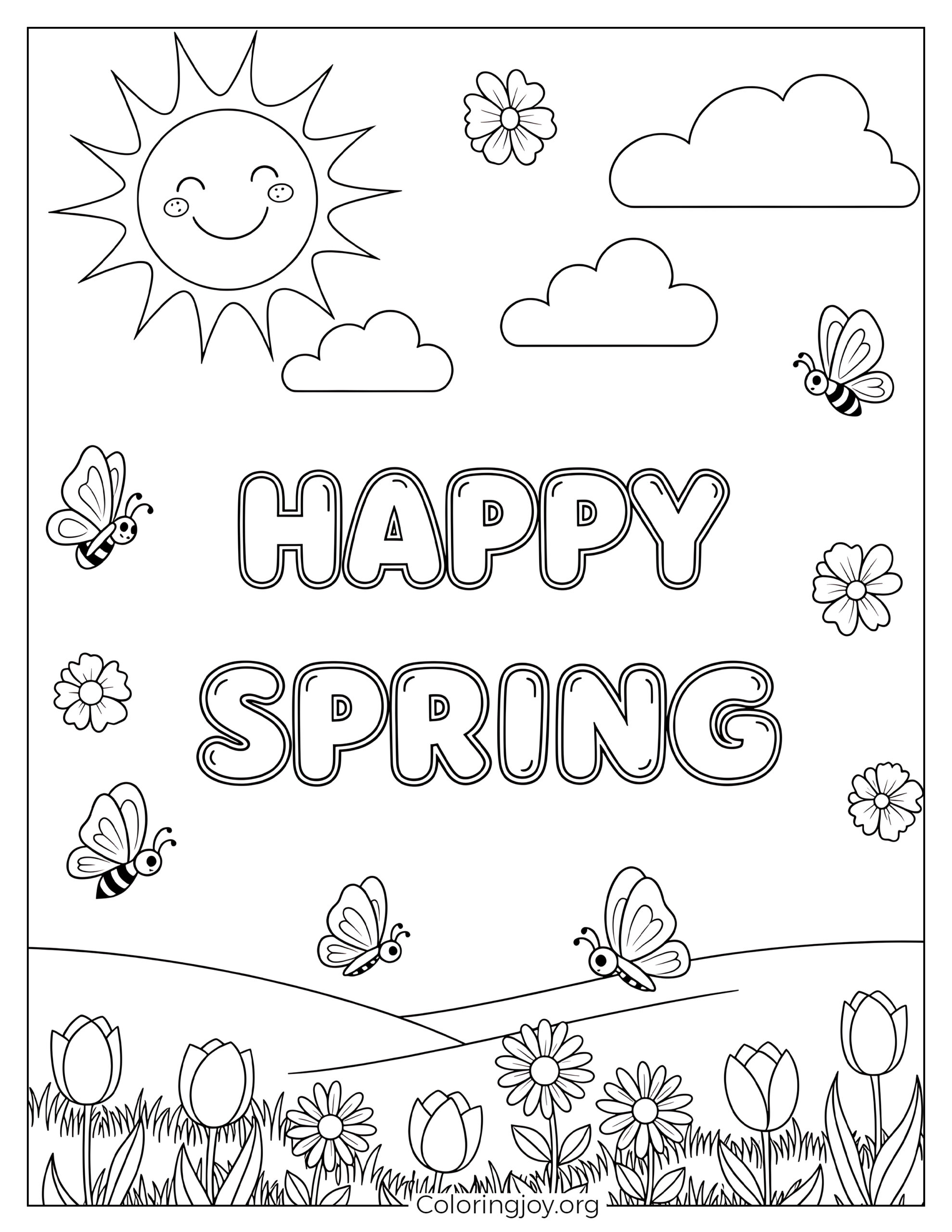 Features a cheerful bird on a branch, blooming spring flowers, playful butterflies, and a smiling sun. Perfect for free printable coloring sheets and easy, joyful creativity.